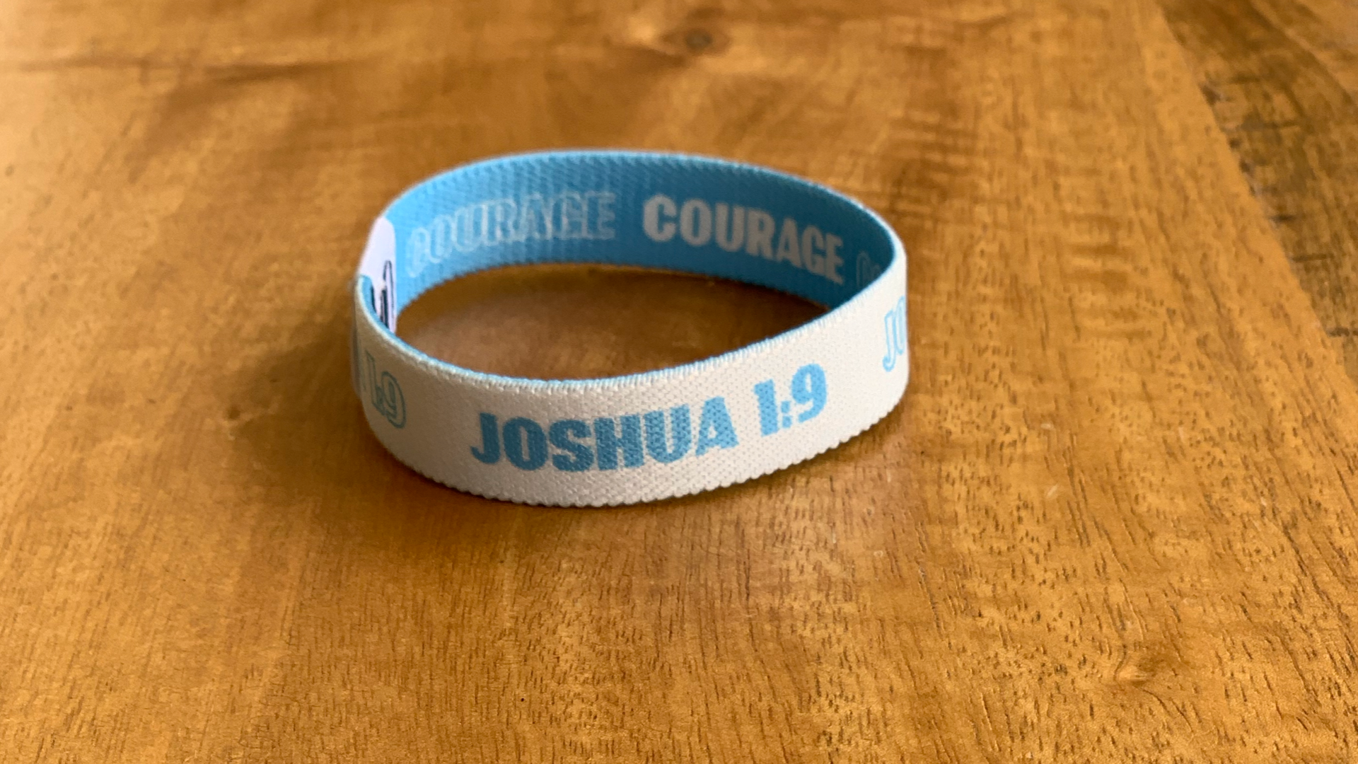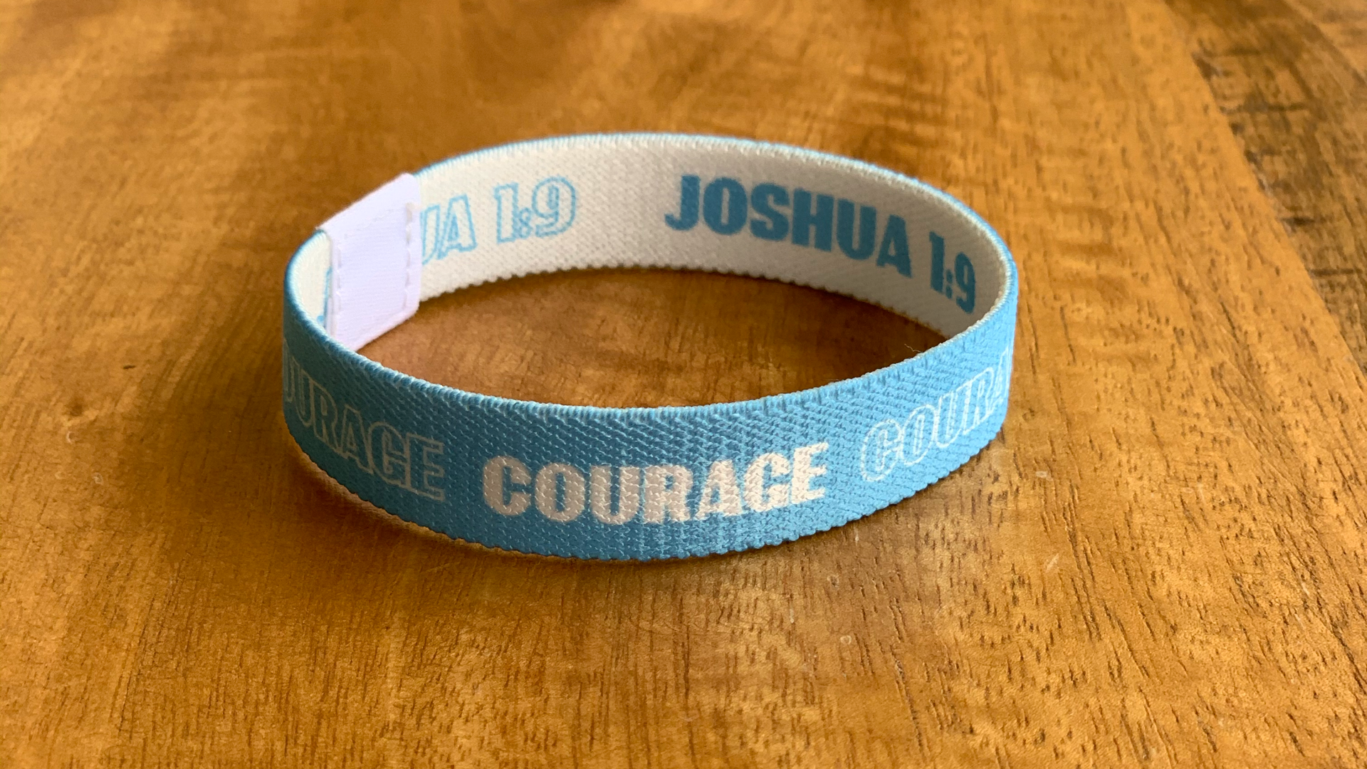 This reversible bracelet has a paled turquoise side with the text "Courage", and a side that is white with the text "Joshua 1:9".