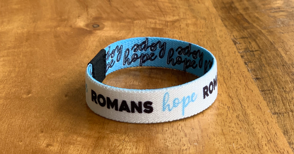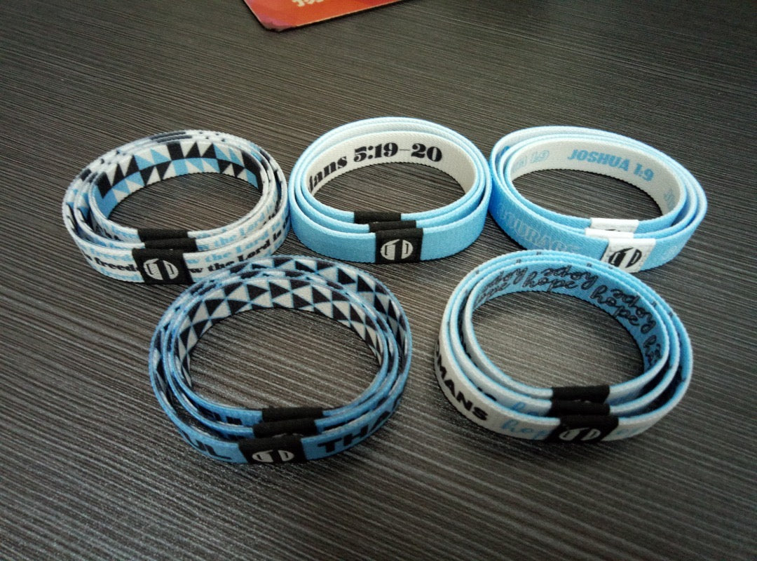 This reversible bracelet has a white side with the text "where the Spirit of the Lord is, there is freedom," and a side that is patterned. The text is written three times in a paled turquoise on the two outside layers and black on the inside layer.
