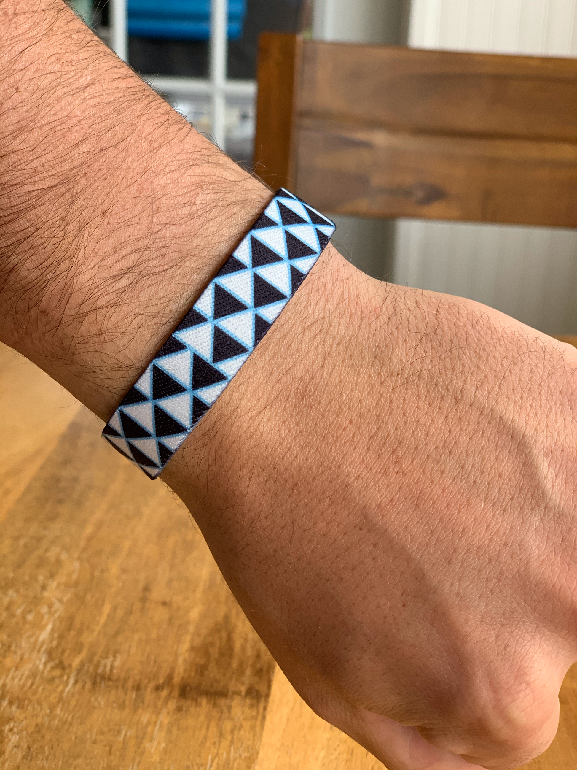 This reversible bracelet has a paled turquoise side with the text "Thankful" in bold, and a side that is patterned with our black, white, and paled turquoise colors.